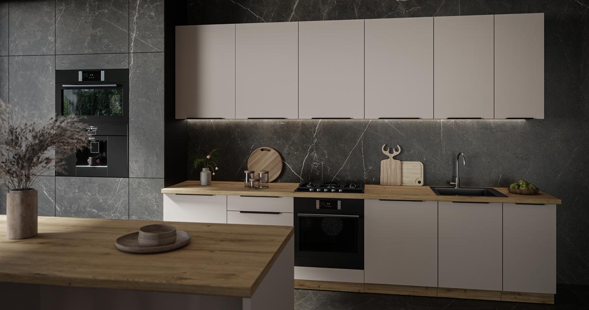 Zestaw kuchenny SOLEA 330 cm to elegancka, nowoczesna propozycja do kuchni otwartej lub zamkniętej. Fronty w matowym kolorze kaszmir zestawiono z korpusem w dekorze dąb artisan, co daje subtelny efekt przytulności i nowoczesnej harmonii. Górne szafki mają wysokość aż 90 cm, co zapewnia zwiększoną pojemność i maksymalne wykorzystanie przestrzeni.