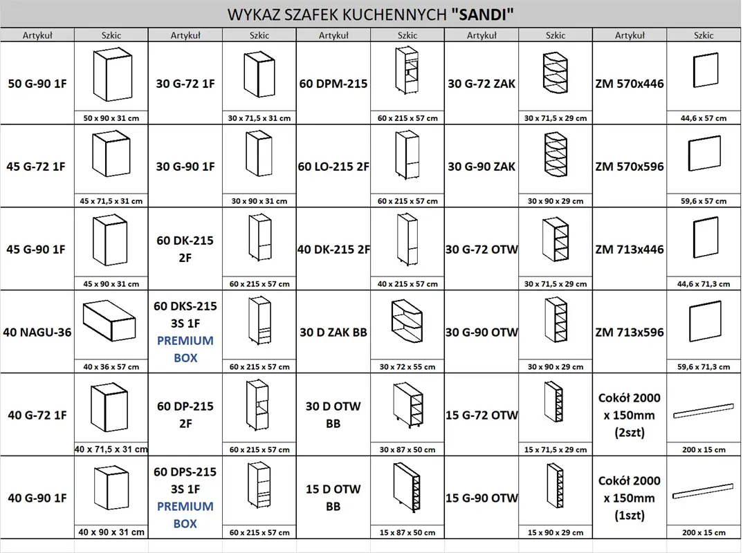 Wykaz wszystkich dostępnych szafek kolekcji SANDI