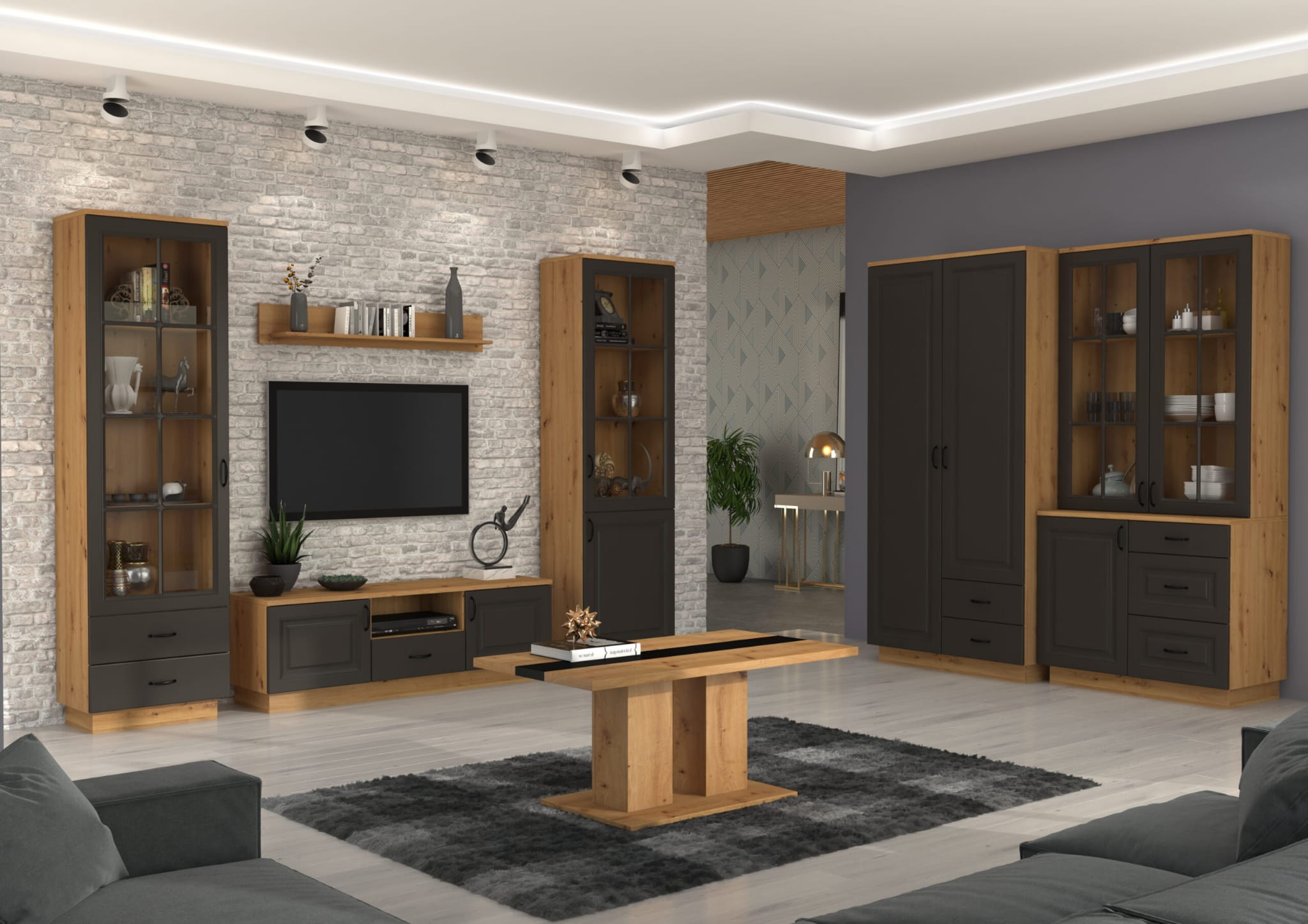 - Witryna FLORA GRAR 60 2D grafit mat/dąb artisan – Elegancka witryna z przestronnymi półkami, idealna do przechowywania naczyń i ozdób.