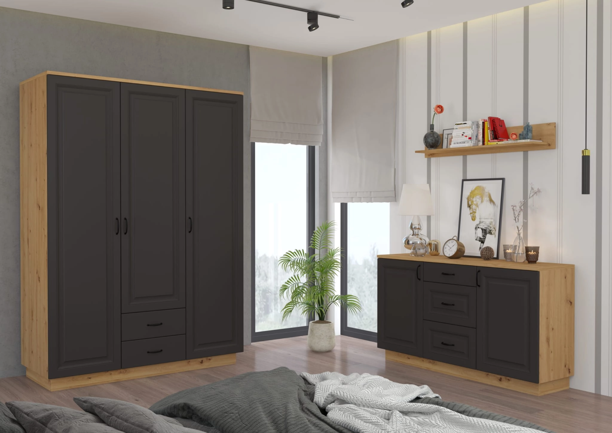 Komoda FLORA GRAR 150 2D3S grafit mat/dąb artisan to połączenie nowoczesnego designu z praktycznością. Wykonana z płyty MDF w kolorze grafitowym, komoda posiada frezowane fronty oraz czarne metalowe uchwyty, nadające jej elegancki wygląd. Dzięki zastosowaniu zawiasów z cichym domykiem oraz prowadnic dolnego montażu QUADRO w szufladach, komoda zapewnia płynne i ciche otwieranie oraz zamykanie drzwi i szuflad.