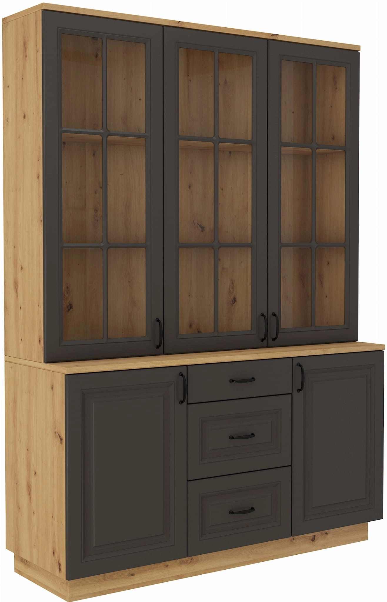 - Witryna FLORA GRAR 60 2D grafit mat/dąb artisan – Elegancka witryna z przestronnymi półkami, idealna do przechowywania naczyń i ozdób.