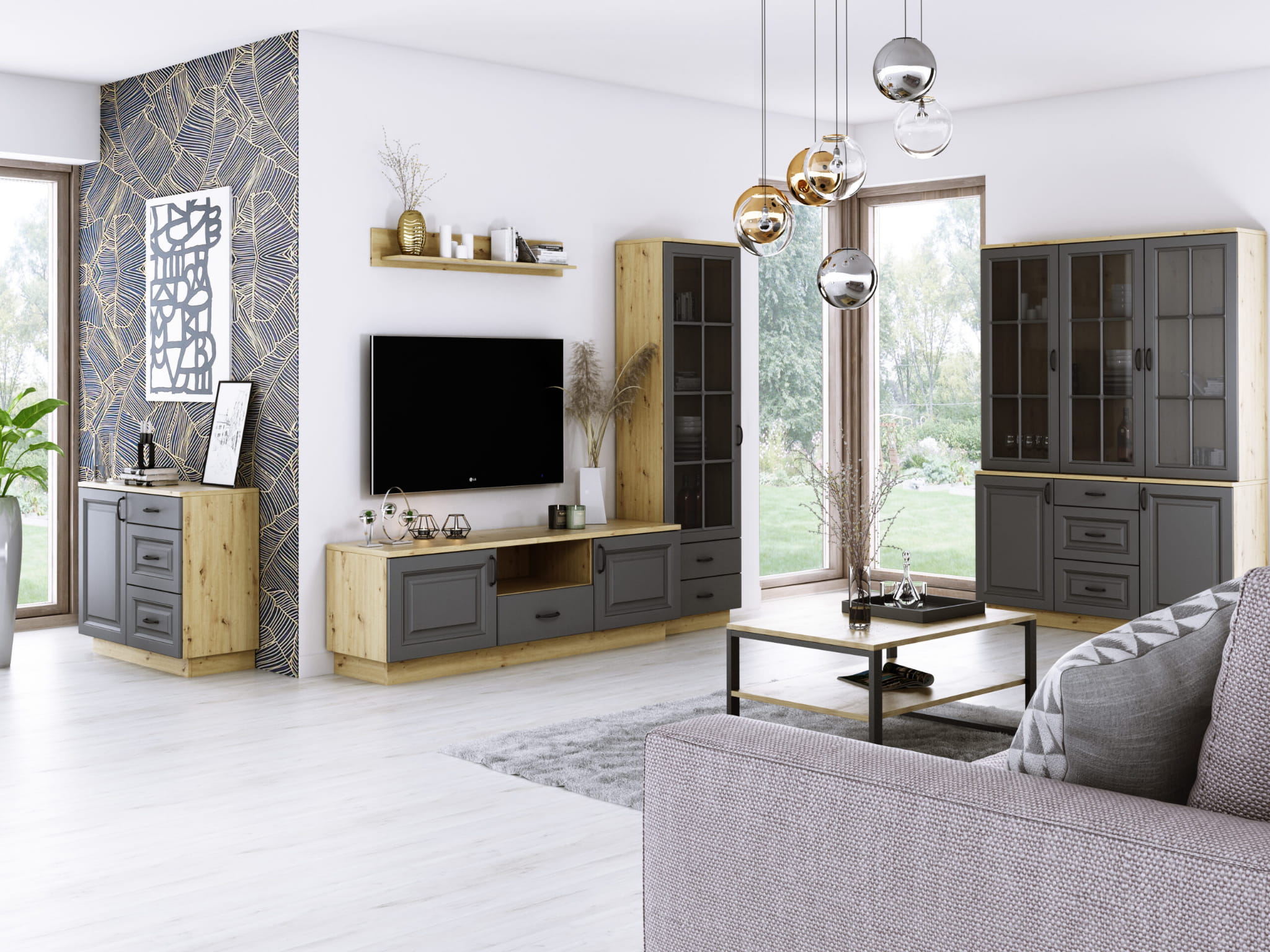 - Elegancka stylistyka: Grafitowy front połączony z dębem artisan wprowadza do wnętrza elegancję i spokój.