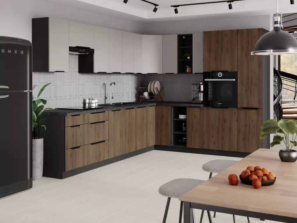 Zestaw mebli kuchennych dół ARRONA kaszmir, góra MONZANA dąb okapi – kuchnia narożnikowa 360x330x200 cm – przestronna kuchnia narożna, zapewniająca maksymalną funkcjonalność.