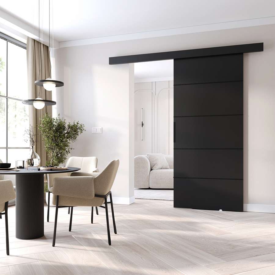 Drzwi przesuwne MATI K100 106cm to doskonały wybór dla osób szukających nowoczesnych rozwiązań do swojego wnętrza. Wyposażone w metalowy, łożyskowany system przesuwny polskiej marki LAGUNA, gwarantują płynne i ciche przesuwanie. Mocny czarny aluminiowy uchwyt o długości 29,5 cm zapewnia wygodne użytkowanie, a czarne ozdobne listwy na froncie drzwi podkreślają ich elegancki i nowoczesny wygląd.