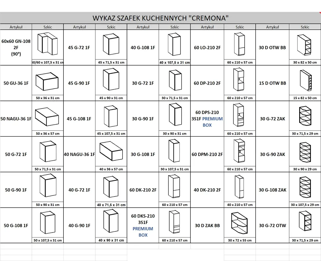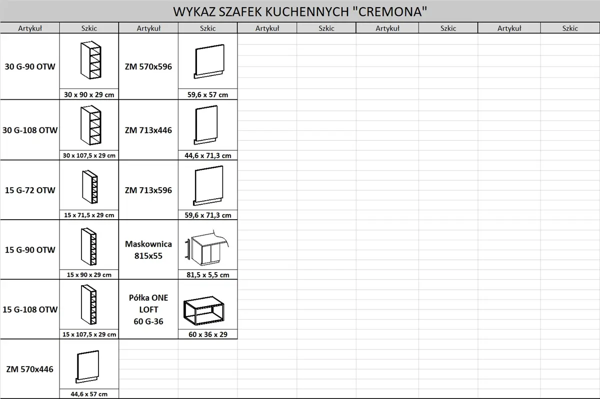 Wykaz wszystkich dostępnych szafek kolekcji CREMONA