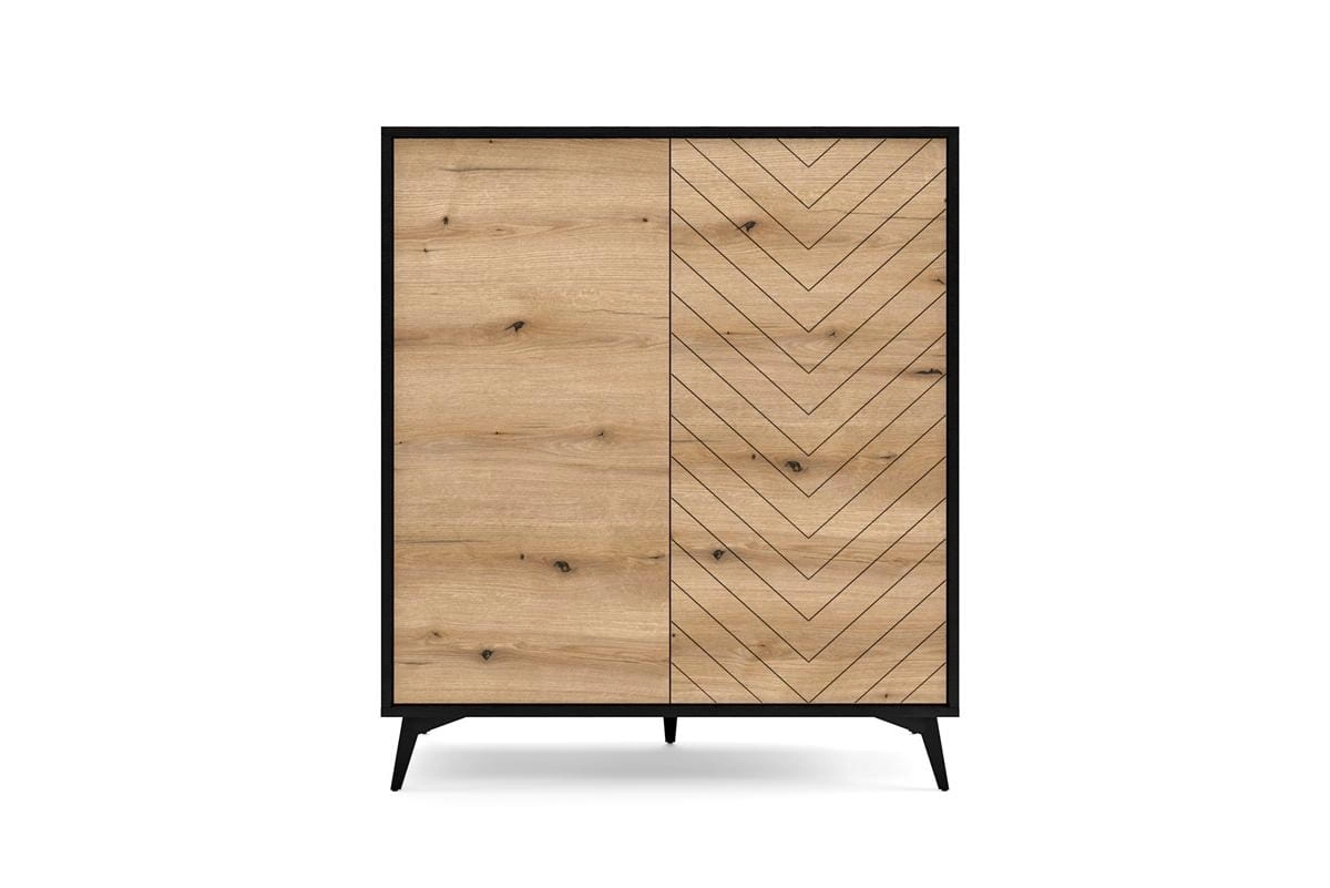 Komoda BRILLANT KD104 to propozycja dla osób ceniących nowoczesny design i luksusowe wykończenie. Czarny korpus w zestawieniu z frontami Dąb Evoke, ozdobionymi frezowanym wzorem jodełki, tworzy niezwykle stylowy mebel pasujący do eleganckich i industrialnych wnętrz.