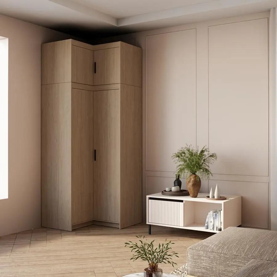 Nadstawka została zaprojektowana jako idealne uzupełnienie szaf ELENA narożnych, tworząc spójny zestaw mebli i zwiększając pojemność bez zajmowania dodatkowego miejsca w pokoju.