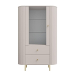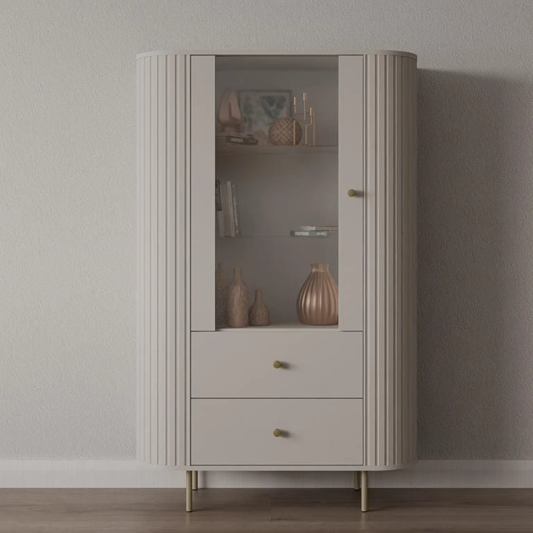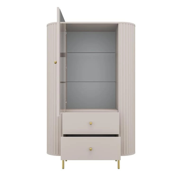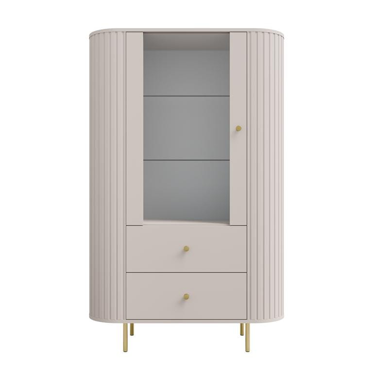 Witryna OVAL 112 – 1F 2S w kolorze beż piaskowy to stylowe połączenie funkcji ekspozycyjnej i praktycznego przechowywania. Ryflowany korpus wykonany z płyty MDF nadaje bryle wyrazisty, dekoracyjny wygląd, a naturalny dekor drewna w zestawieniu z czarnymi akcentami doskonale wpisuje się w nowoczesne aranżacje wnętrz.