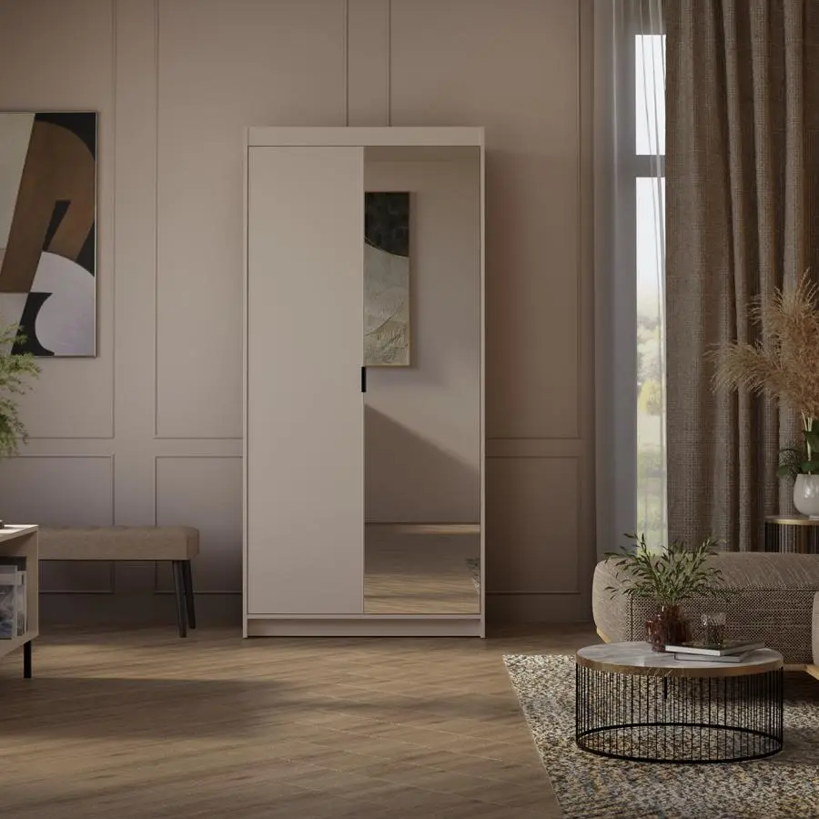 Stylowa i funkcjonalna szafa ELENA DP2D w kolorze beż piaskowy z lustrem to idealne rozwiązanie do sypialni, garderoby lub przedpokoju. Modny odcień beżu wprowadza do wnętrza ciepło i elegancję, a lustro na froncie optycznie powiększa przestrzeń i dodaje wnętrzu światła.