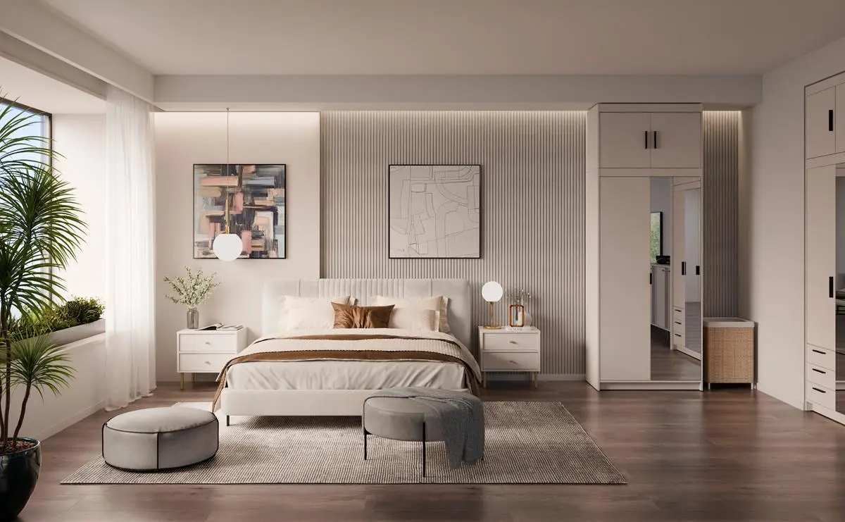 Kolor beż piaskowy idealnie pasuje do wnętrz w stylu nowoczesnym, japandi, klasycznym oraz skandynawskim – świetnie komponuje się z dekorami dąb artisan, dąb cremona czy czarny mat, które często wybierają klienci Meblolandia do sypialni.