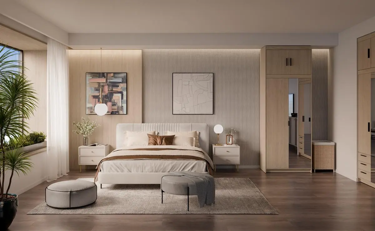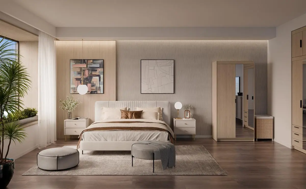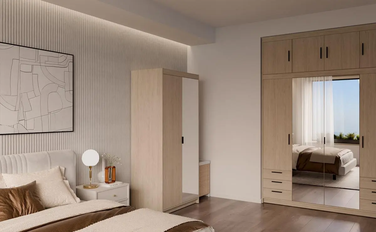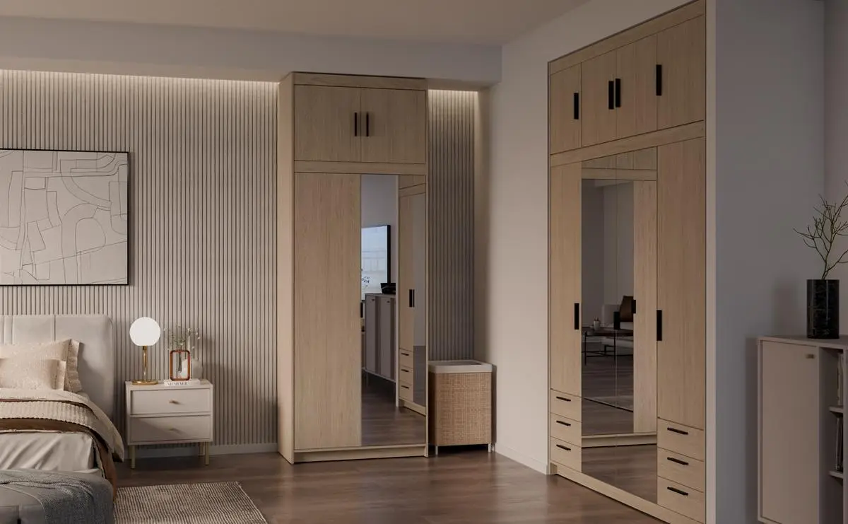 Kolor dąb olejowany świetnie komponuje się z dodatkami w kolorze czarnym, beżowym, cashmere oraz białym, które często wybierają klienci Meblolandia do sypialni i garderób.