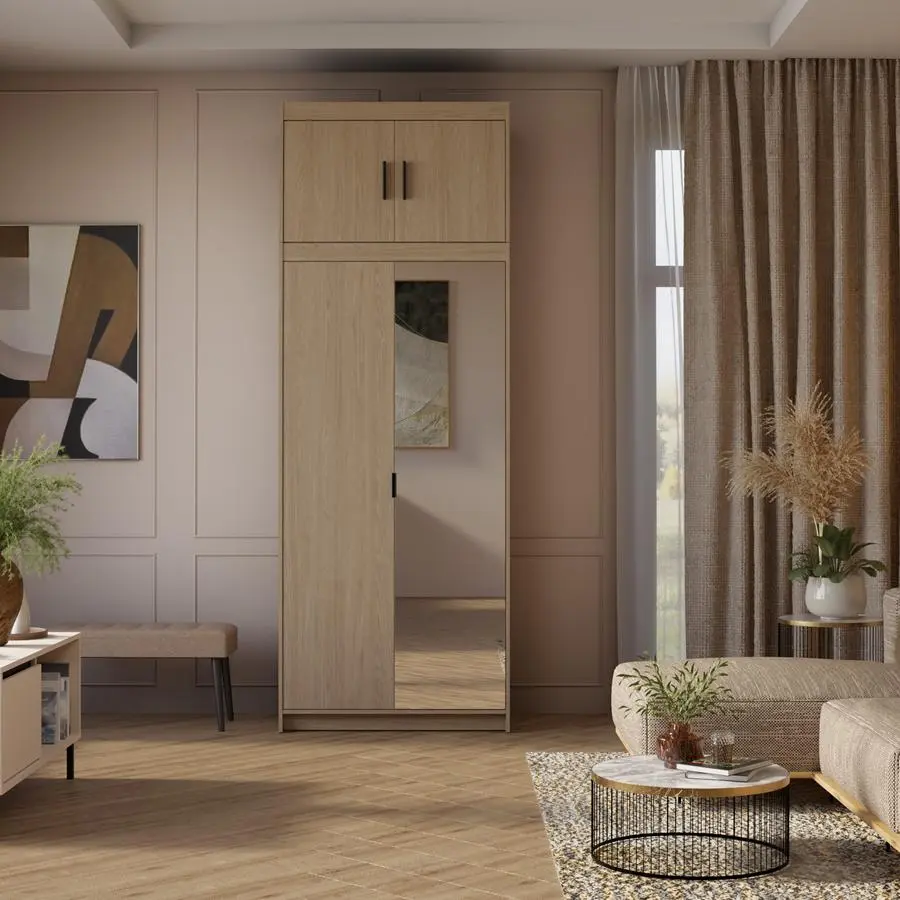 Stylowa i funkcjonalna szafa ELENA DO2D w kolorze dąb olejowany to idealny wybór do sypialni, garderoby lub przedpokoju. Naturalny dekor drewna wprowadza do wnętrza ciepło i przytulny charakter, a lustro na froncie optycznie powiększa przestrzeń i dodaje światła.
