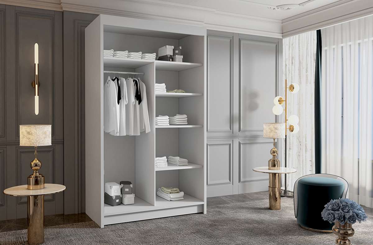 Wnętrze szafy zostało starannie zaprojektowane, aby sprostać oczekiwaniom wymagających użytkowników. Znajdują się w niej liczne półki, szuflady oraz wieszaki na ubrania, co pozwala na porządkowanie garderoby zgodnie z indywidualnymi potrzebami. Dostęp do przechowywanych rzeczy ułatwiają również dodatkowe oświetlenie LED.