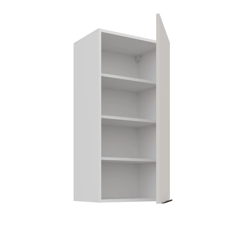 Szafka kuchenna górna 45 G 90 1F KOMA Kaszmir / Biały mat to elegancka szafka górna, zaprojektowana do przechowywania akcesoriów kuchennych. Wyposażona w jeden front, posiada trzy półki, które zapewniają przestronność do przechowywania. Zawiasy z cichym domykiem oraz metalowy uchwyt czarny mat zapewniają wygodę codziennego użytkowania. Wnętrze szafki w kolorze białym sprawia, że przestrzeń w szafce jest jaśniejsza, co ułatwia organizację i utrzymanie porządku. Możliwość montażu szafki jako prawa lub lewa daje elastyczność w aranżacji kuchni.