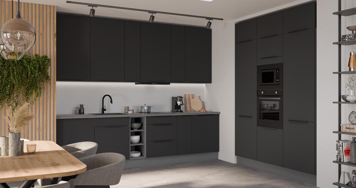 Wybierz ARIANA Black/Antracyt i stwórz kuchnię, która łączy elegancki design, maksymalną funkcjonalność i nowoczesną zabudowę pod sam sufit.