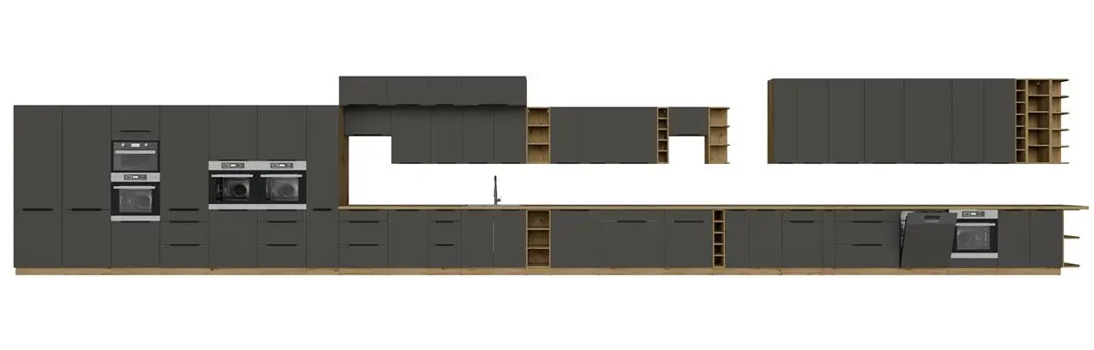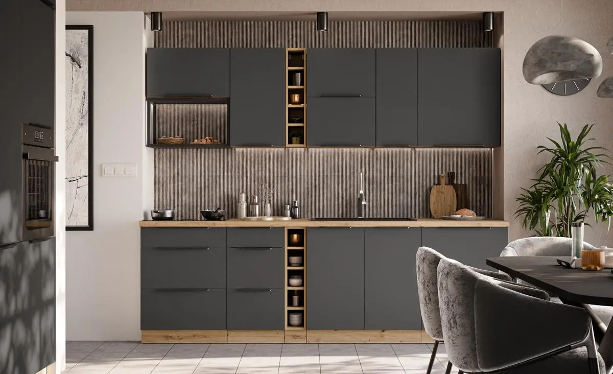 ARIANA GRAFIT/ARTISAN to propozycja dla osób, które cenią nowoczesny styl z naturalnym akcentem drewna. Połączenie głębokiej czerni z ciepłym dekorem Artisan tworzy elegancką, a jednocześnie przytulną aranżację kuchni.