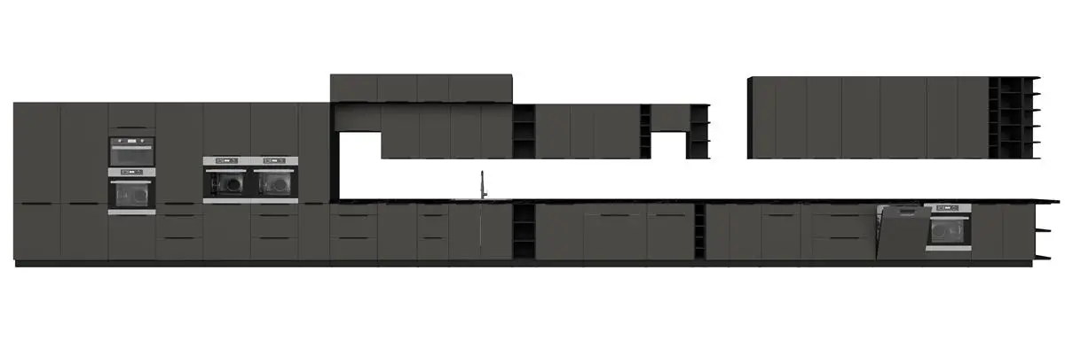 ARIANA GRAFIT/CZARNY to propozycja dla miłośników nowoczesnych, minimalistycznych wnętrz. Jednolita czarna zabudowa nadaje kuchni elegancki, wyrazisty charakter i doskonale komponuje się z jasnym blatem, drewnianą strukturą lub betonowymi akcentami.