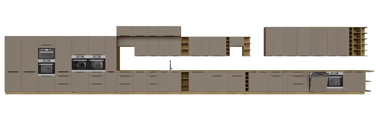 Zestaw ARIANA Sandgrau/ARTISAN obejmuje praktyczne szafki dolne z pojemnymi szufladami, szafkę zlewozmywakową, moduły otwarte oraz funkcjonalne szafki górne o wysokości 72 cm. Dodatkowe nadstawki GU-36 umożliwiają zabudowę w wyższej konfiguracji, co pozwala lepiej zagospodarować przestrzeń nad szafkami.