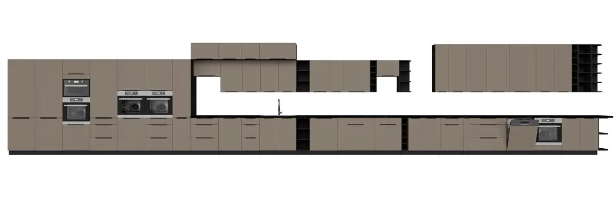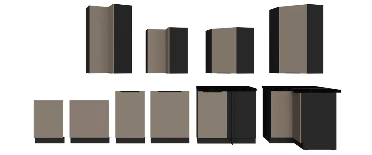 Zestaw ARIANA SANDGRAU/CZARNY obejmuje praktyczne szafki dolne, w tym model z trzema szufladami, szafkę pod płytę gazową oraz pojemną szafkę zlewozmywakową. Uzupełnieniem zabudowy jest wysoki słupek 210 cm oraz rozbudowana strefa górna z szafkami o wysokości 108 cm i nadstawką NAGU-36.