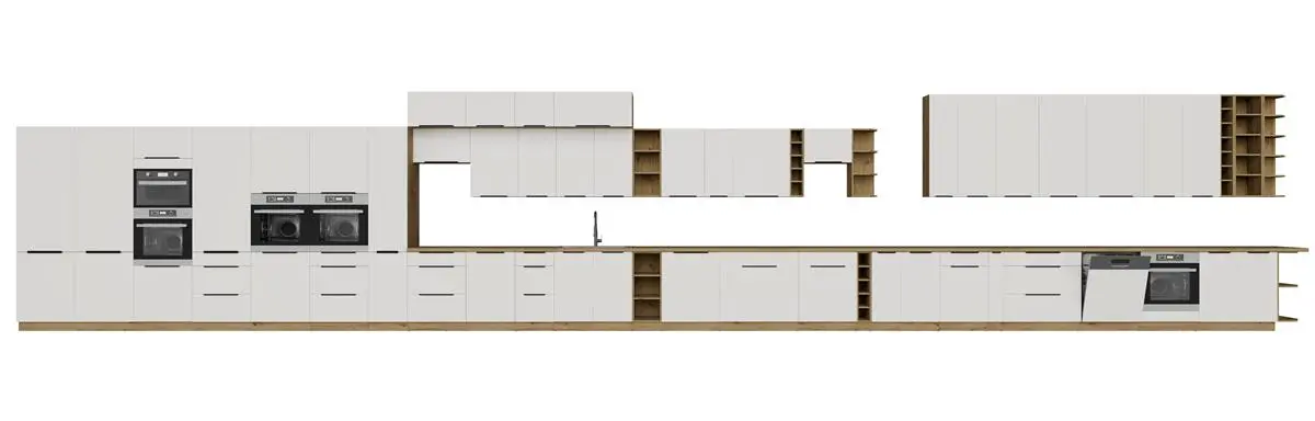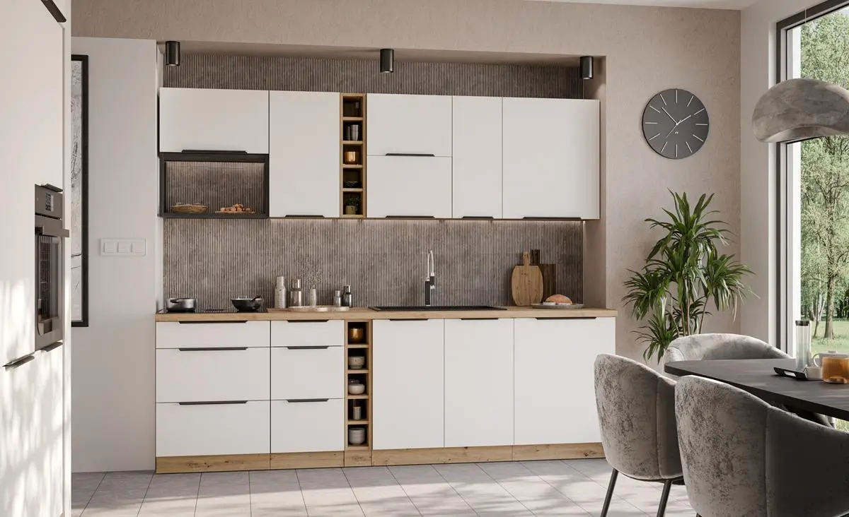 ARIANA WHITE/ARTISAN to propozycja dla osób, które cenią nowoczesny styl z naturalnym akcentem drewna. Połączenie głębokiej czerni z ciepłym dekorem Artisan tworzy elegancką, a jednocześnie przytulną aranżację kuchni.