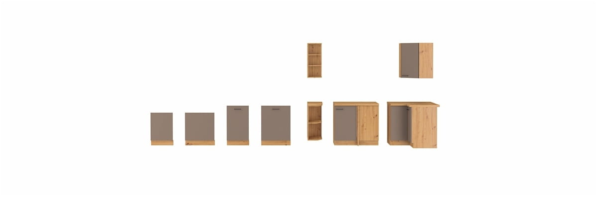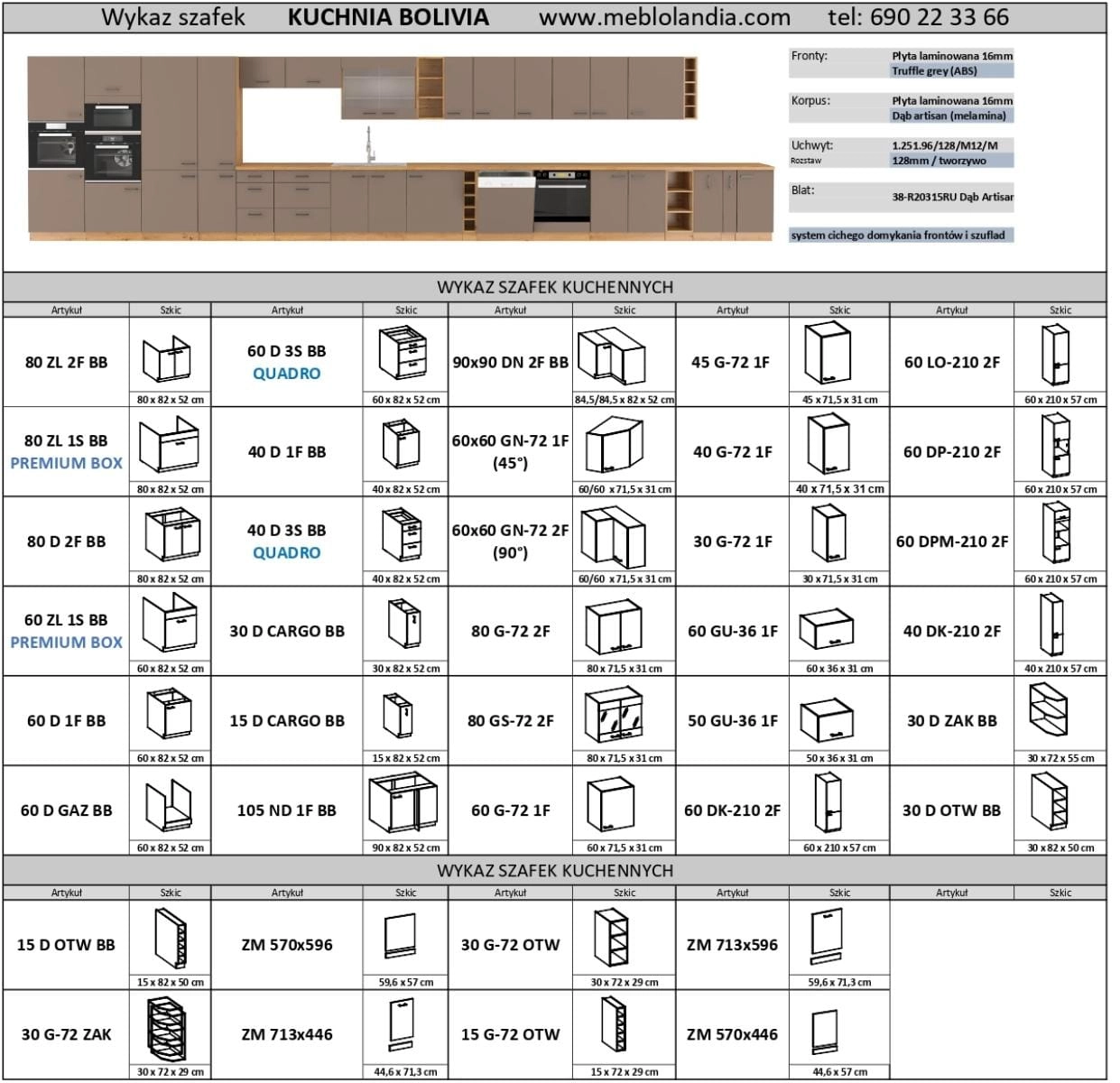 Zestaw mebli kuchennych BOLIVIA to doskonały wybór dla osób ceniących elegancję i ergonomię w kuchni. Fronty w odcieniu trufla grey harmonizują z korpusami w kolorze dąb artisan, tworząc ciepłe i stylowe wnętrze. Układ szafek pozwala na wygodne przechowywanie naczyń, akcesoriów i produktów spożywczych.