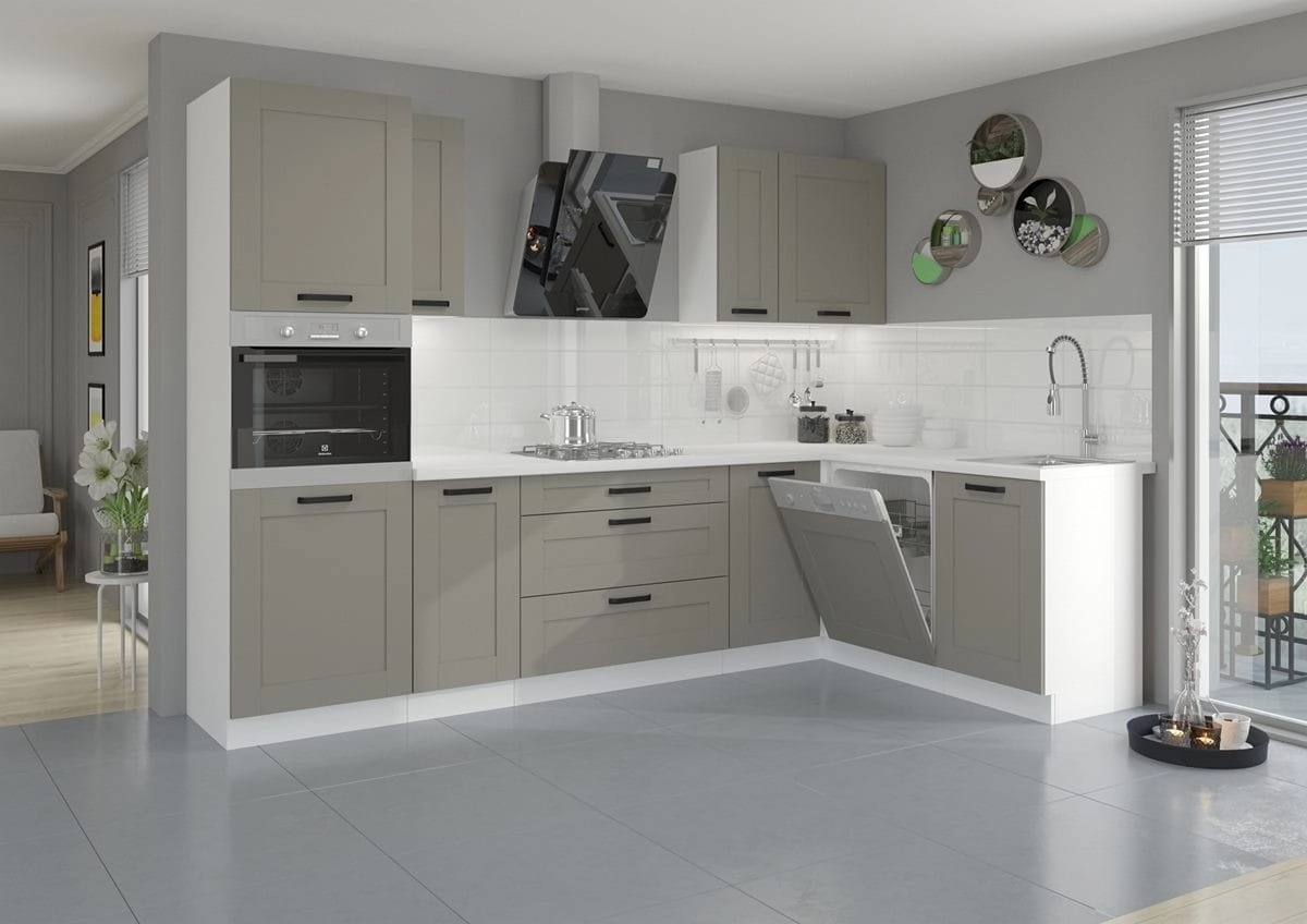 Zestaw mebli kuchennych LUNEA – jasny szary / biały mat (285x170 cm)