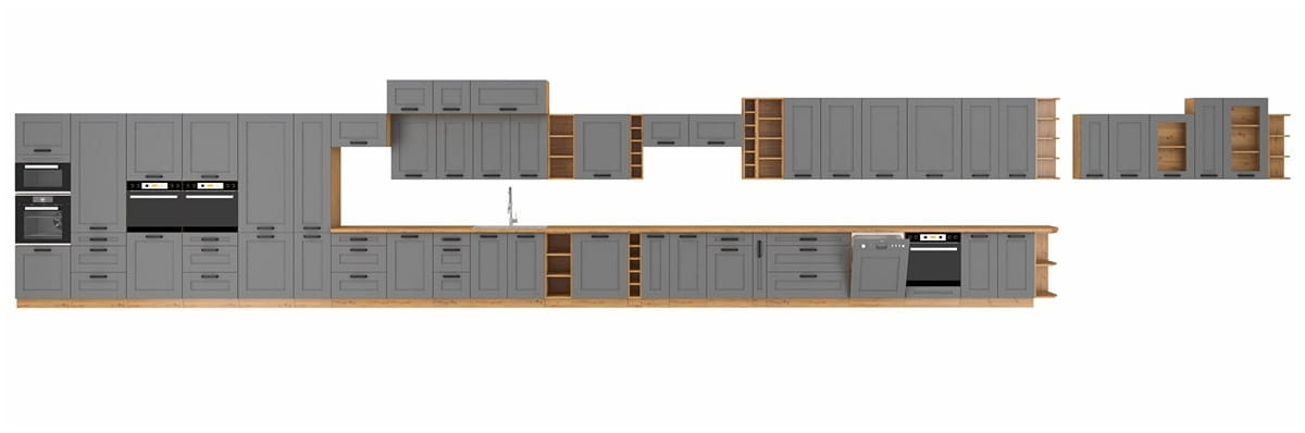 - Ciemnoszare matowe fronty w zestawieniu z ciepłymi korpusami w kolorze dąb artisan nadają wnętrzu wyjątkowy styl i przytulny charakter.