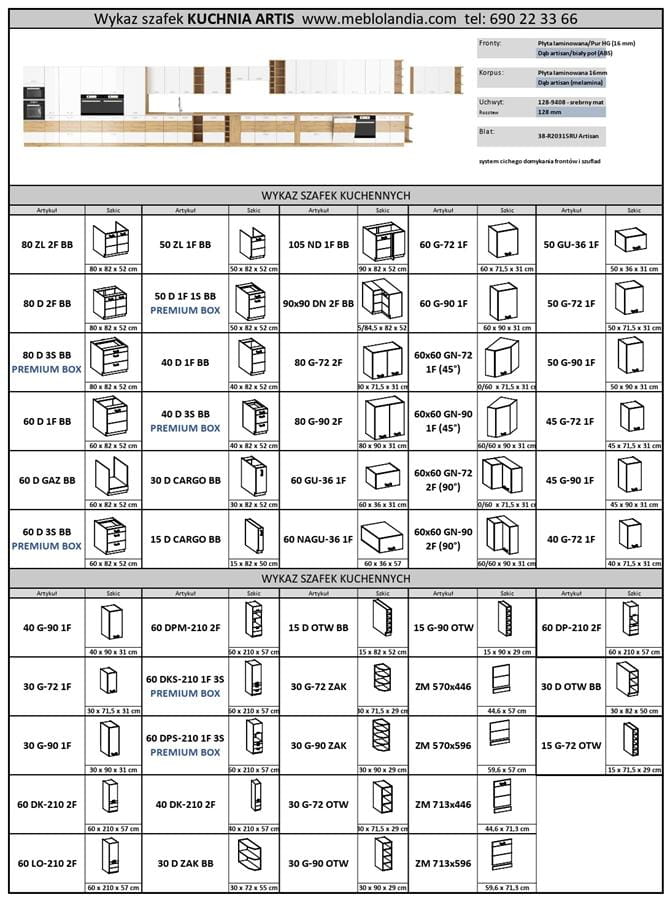 - Wysokość dolnych szafek: 82 cm