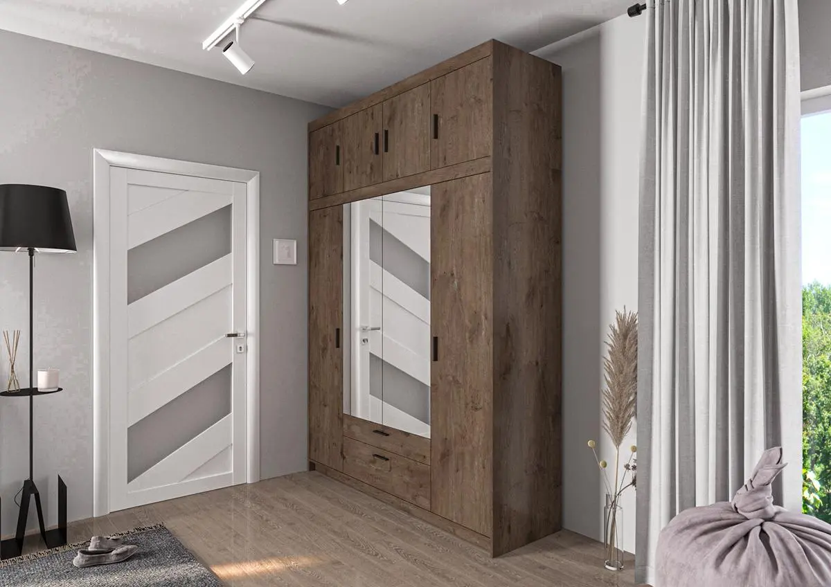 Duża i elegancka szafa ELENA 4D z lustrem o szerokości 176 cm to doskonały wybór do sypialni, garderoby lub przedpokoju. Lustro na froncie optycznie powiększa przestrzeń i rozjaśnia wnętrze, a dekor dąb lefkas wprowadza naturalny i elegancki charakter do aranżacji.