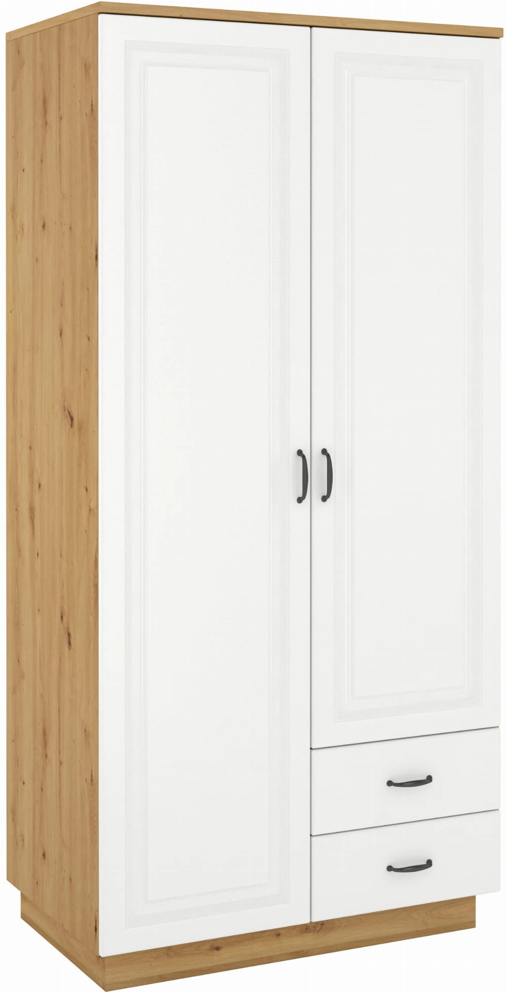 - Opis: Szafa z dwoma drzwiami i dwiema szufladami, oferująca funkcjonalne wnętrze z półkami oraz drążkami ubraniowymi. Wnętrze szafy zapewnia optymalną organizację przestrzeni, z trzema półkami w drzwiach prawych i dwiema półkami oraz drążkiem ubraniowym w lewej części. Dodatkowo wyposażona w system cichego domykania oraz prowadnice QUADRO dla wygodnego i cichego użytkowania.