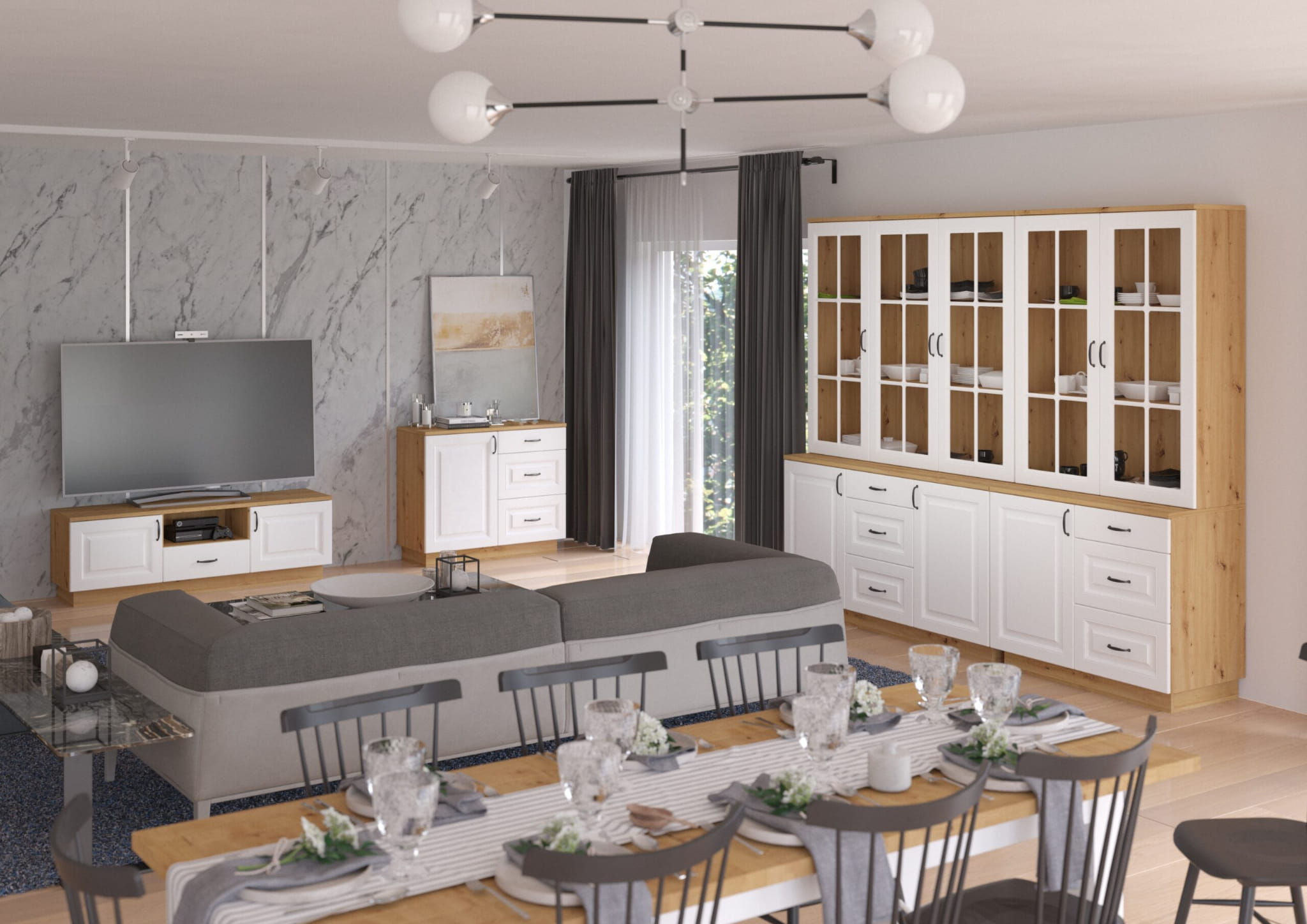 - Witryna FLORA WHAR 60 2D biały mat/dąb artisan – Elegancka witryna z przestronnymi półkami, idealna do przechowywania naczyń, książek czy ozdób.